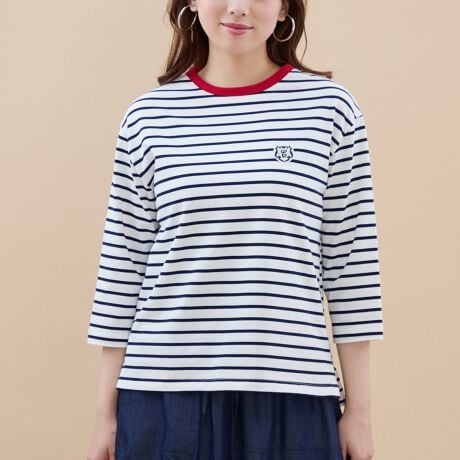 首元のパイピングカラーがアクセントのボーダーTシャツ。