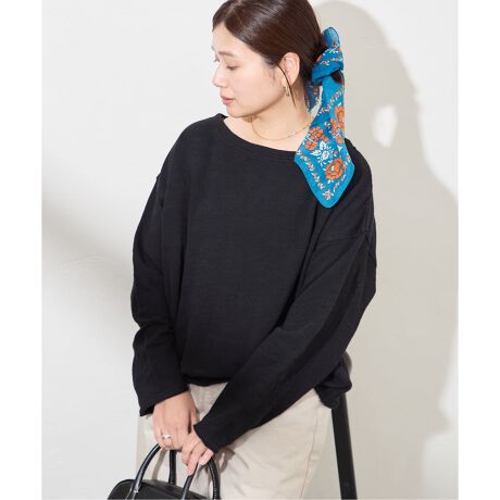 ボートネックデザインで首元はすっきり見えしつつ、ボディはざっくりと着ていただけるゆとりのあるシルエットのバランスが◎