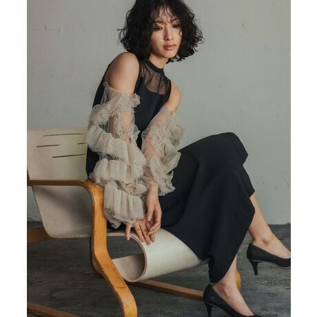 合わせるワンピースはシンプルなデザインに抑えて、ボリュームスリーブがより際立つバランスに。