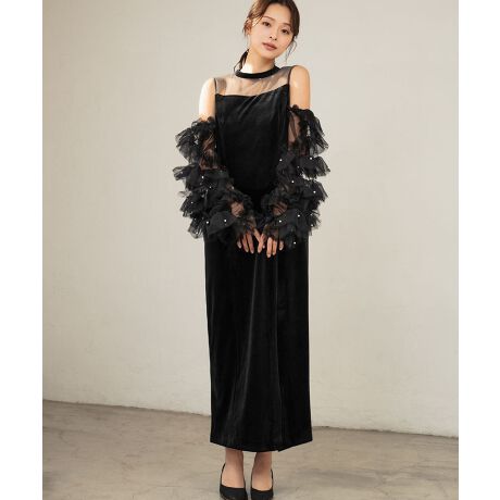 ワンピ部分はベロア生地に変更し、袖チュールにポイントでパールをあしらったレディなドレス。