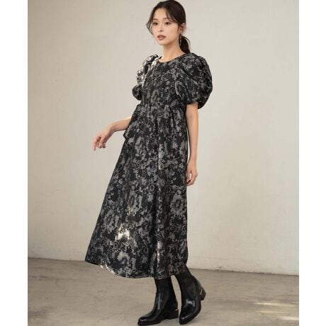 バブルスリーブジャガードドレス 結婚式 ワンピース パーティードレス