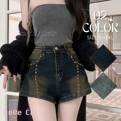 -スタッズが映えるヴィンテージ風デニムショートパンツ