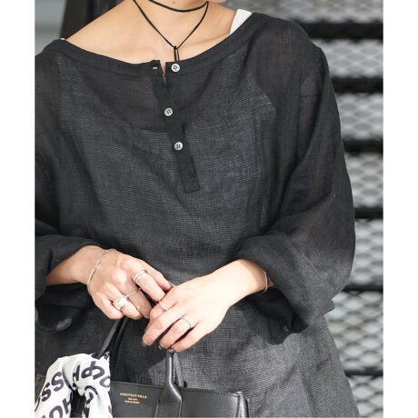 清涼感あふれるリネン100%、着心地の良いメッシュ素材を使用した2WAYブラウス。