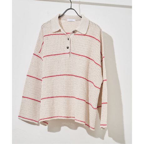 ペーパーヤーンをMIXさせてカノコ柄ボーダー編みにしたポロニット。