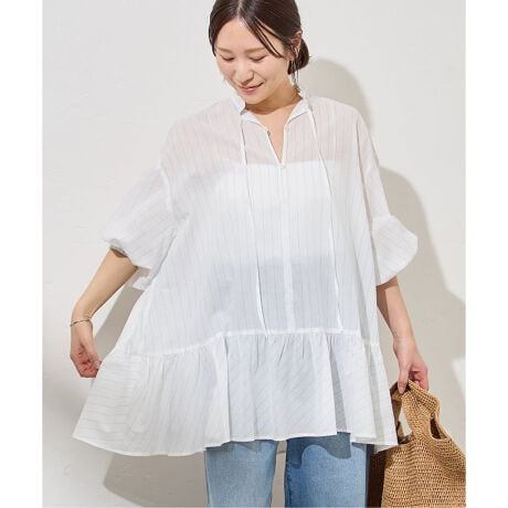 コットン100%の柔らかくて快適に着られるボイル素材を使用。デザインは、フリルで女性らしさがありつつも、ピンストライプ柄がマニッシュで、その組み合わせのバランスが◎大人テイストで着ていただけます。