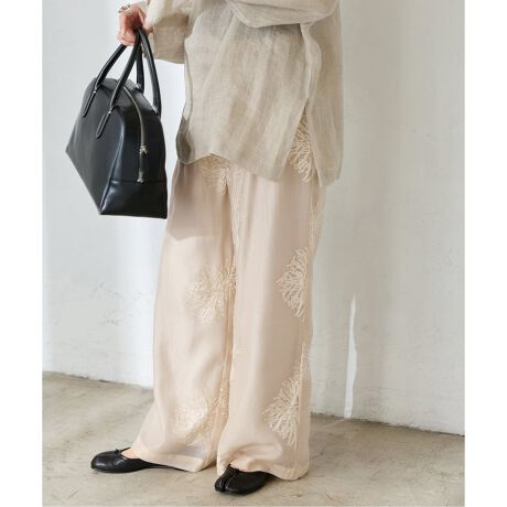 シアーな生地に花柄の刺繍が入ったイージーパンツに、薄手のサテンのイージーパンツがレイヤードされている2WAY仕様のパンツ。インナーパンツは内側のボタンで取り外し可能です。
