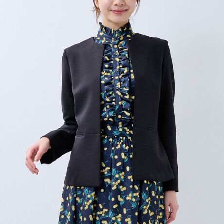 定番のベーシックシリーズから、ハイネックのトップスと相性抜群なノーカラージャケットが登場。ウエストから切り替えを施しなだらかに広がるシルエットに仕上げることで、女性らしく美しいラインを演出します。フロントのフックを外した抜け感のあるスタイリングもおすすめ。ワンピースに羽織った着こなしや同素材のボトムスと合わせてセットアップ風の着こなしも楽しめます。