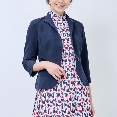 定番のベーシックシリーズから、エレガントさが引き立つスタンドカラーのジャケットが登場。ウエストにかけてくしゅっとしたギャザーを寄せることでさりげない表情感を生み、華やかな印象に仕上げました。動きやすく快適な着心地を演出するストレッチ性のある生地を採用。同素材のボトムスと合わせたセットアップ風のスタイリングもおすすめです。
