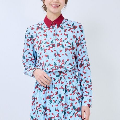 カラフルな色使いが華やかなムードを演出するチェリープリントブラウス。襟と袖の切り替えに無地の生地を使用することで、さりげないアクセントになります。チェリープリントは可愛くなりすぎない上品さのある写実的なタッチがポイント。同シリーズのスカートと一緒に着用することでワンピース見えにもなり、単品使いとして無地のボトムスと合わせるコーディネートもおすすめです。