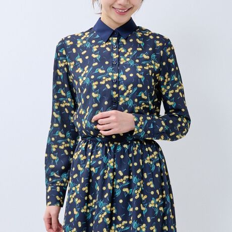 カラフルな色使いが華やかなムードを演出するチェリープリントブラウス。襟と袖の切り替えに無地の生地を使用することで、さりげないアクセントになります。チェリープリントは可愛くなりすぎない上品さのある写実的なタッチがポイント。同シリーズのスカートと一緒に着用することでワンピース見えにもなり、単品使いとして無地のボトムスと合わせるコーディネートもおすすめです。