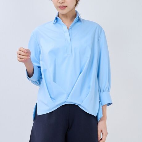 裾に大きめのタックをあしらい、ブラウジングしたかのような雰囲気を楽しめるプルオーバーシャツ。ヒップラインも美しい丸さを演出することができ、バックスタイルにもこだわっています。細番手の糸を使用したストレッチ性のあるツイル素材を採用。滑らかで上品な光沢のあるブロード生地がエレガントな風合いを放ちます。ロング丈のタイトスカートやワイドパンツと合わせたきれいめな装いがおすすめです。