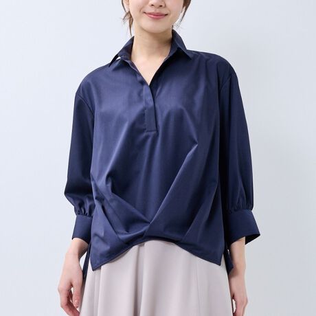 裾に大きめのタックをあしらい、ブラウジングしたかのような雰囲気を楽しめるプルオーバーシャツ。ヒップラインも美しい丸さを演出することができ、バックスタイルにもこだわっています。細番手の糸を使用したストレッチ性のあるツイル素材を採用。滑らかで上品な光沢のあるブロード生地がエレガントな風合いを放ちます。ロング丈のタイトスカートやワイドパンツと合わせたきれいめな装いがおすすめです。