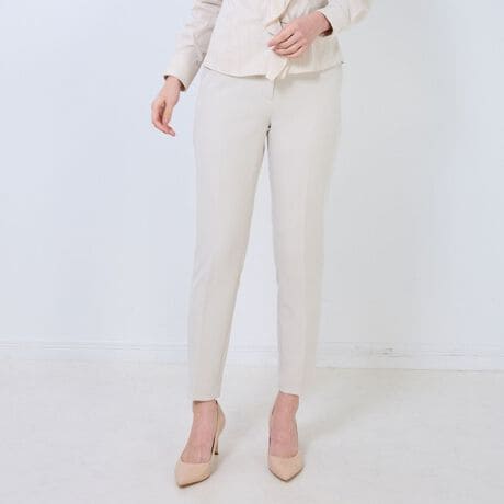 定番のベーシックシリーズから、脚のラインをすっきりと見せるテーパードシルエットが特徴的なパンツが登場。生地には伸縮性があるため動きやすく、締め付け感の少ない穿き心地を実現します。センタープレス入りのシンプルなデザインが魅力。ブラウスやシャツと合わせてオフィスシーンで着用したり、薄手のニットやジャケットと合わせたコーディネートもおすすめです。
