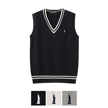 シンプルな配色で合わせやすく、スッキリして見えるメンズライン入りベスト。ハイツイストドライタッチコットンを使用しており、強く撚りをかけた繊維の長い糸で目を細かく編むことにより、型崩れしにくく、光沢のあるきれいな表面のニットに仕上げました。丈夫でサラッとした心地良い肌触りです。左胸に女神刺繍入り。