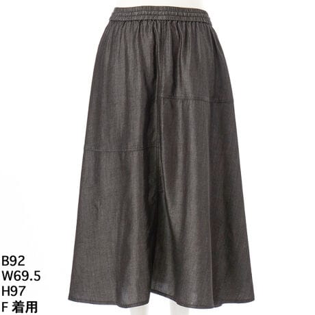 再生繊維(セルロース)100%の柔らかな落ち感が、広がりすぎない絶妙なフレアラインを描き、気になる腰周りをさりげなくカバーしてくれます。