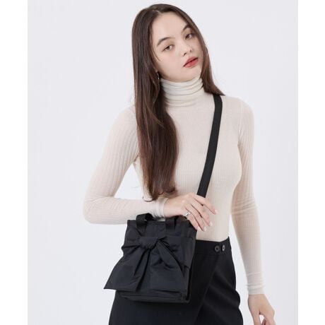 取り外し可能なショルダーストラップ付きの縦型ミニトートバッグ。小さめながら十分なマチがあるので、ミニ財布、スマートフォン、メイクポーチ、エコバッグなど必要最低限のものがすっぽり収納できます。ちょっとしたお出かけはもちろん、サブバッグとしてもおすすめ。大きなリボンが上品さの中に可愛らしさを添え、コーディネートのアクセントにも◎。