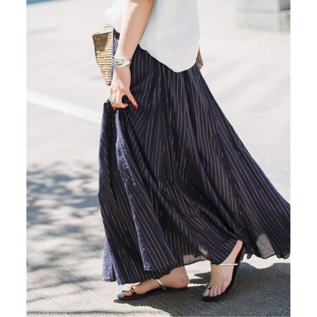 細い金糸を織り込んだ、Spick & Spanオリジナルのストライプ柄が魅力のギャザーフレアスカート。