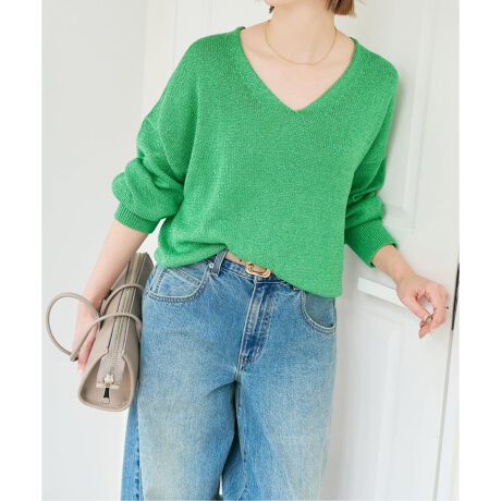 ペーパーヤーンに光沢のあるレーヨンを撚糸した、オリジナル素材を使用したVネックプルオーバーです。
