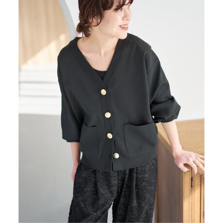 大きめのゴールドボタンが程よい華やぎを添え、羽織としてはもちろん、ボタンを閉じて一枚着トップスとしても着映えるデザイン。