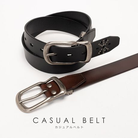 印象的なバックルと、ベルトの先にも印象的なスタッズを施した存在感あるベルト。