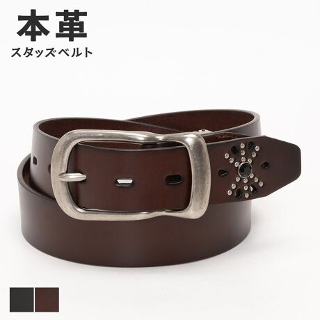 印象的なバックルと、ベルトの先にも印象的なスタッズを施した存在感あるベルト。