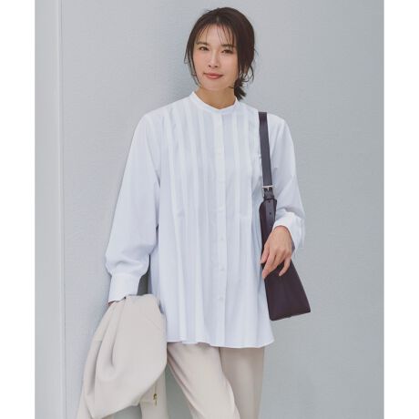 ■デザインすっきりとしたバンドカラーに、太めのピンタックが映えるブラウス。裾に向かってふんわりと広がるシルエットが、体のラインを拾いすぎずリラックス感のある着心地を叶えます。ヒップまでしっかり隠れるやや長めの丈も嬉しいポイント。体型をカバーしつつ、バランスよく着こなせるアイテムです。袖口のカフスはボタンでサイズ調整が可能なため、お好みに合わせて着用いただけます。