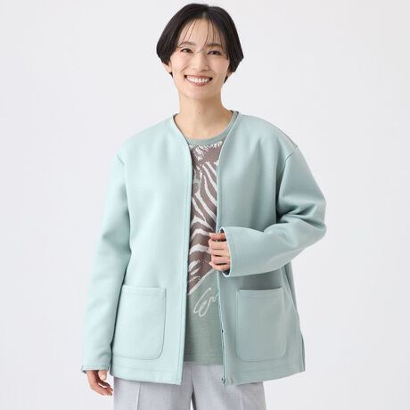 ダンボールニット素材を使用した、クルーネックのコーディガン。程よい肉感と丈感で、室内の軽い羽織としても、春先のライトアウターとしても活躍します。裏面には同系色のゼブラ柄をプリントしました。袖口を折り返して柄をのぞかせることで、スタイリングのアクセントになります。前端から衿ぐりにかけてあしらったグログランテープも、さりげないポイントに。軽やかな仕上がりを目指し、ファスナーの付け方にもこだわりました。