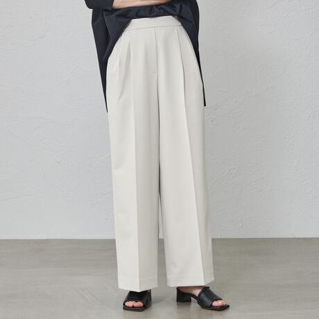 ウエストゴム仕様でイージーな履き心地ながら、裾に向かってきれいにタックが入っており、脚が真っ直ぐ見えるパンツに仕上がっています。