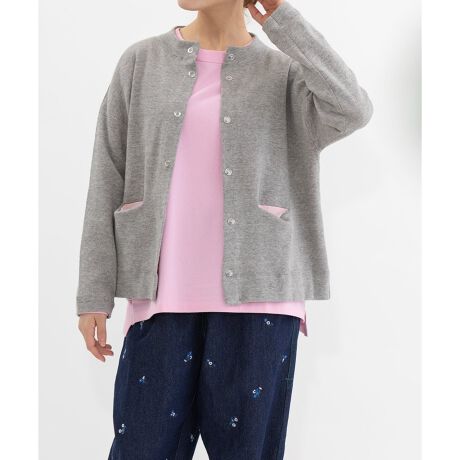 春にちょうどいい、スエット風のカーディガン。表側も裏側もコットンで編み立てたダブルニット仕立てで、軽さがありながらもしっかりとした裏毛スエットのような風合いが特徴です。衿はダブル付けのハイネック風で、すっきりと留まるドットボタン仕様。配色のポケット袋布がさりげないアクセントになり、背中にはロゴのインターシャ入りで後ろ姿までぬかりのないデザインです。