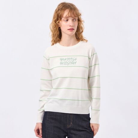 手書き風のブランドロゴをチェーンステッチ刺しゅうで表現したニットプルオーバーです。カジュアルなアイテムながら、ほどよい肉感とハリのある編素材で、クリーンな印象に仕上げました。