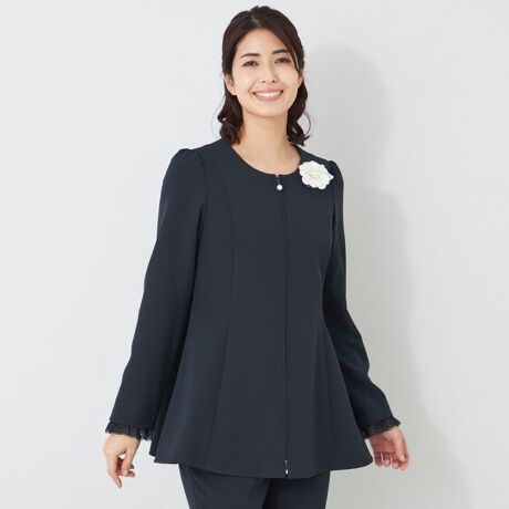 ショルダーラインからバストラインにかけて切り替えを入れることで、胸元に立体感と自然なボリュームを出し、美しいシルエットを表現しています。裾に向かってフレアーを施すことで、ヒップラインをさりげなくカバーできるデザインです。フロントは上下スライダー仕様で、下側を開けることでシルエットの変化も楽しめます。袖口には取り外し可能なケミカルレースをあしらい、華やかさをプラスしています。