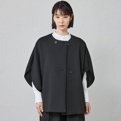 ポンチョのような丸いシルエットが目をひく、ジャージー素材のジャケットです。