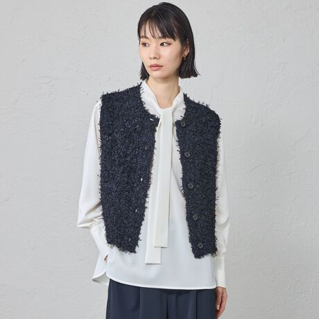 意匠感のある編地のニットベスト。ボクシーなシルエットで短い丈に仕上げているので、レイヤードアイテムとして活躍します。