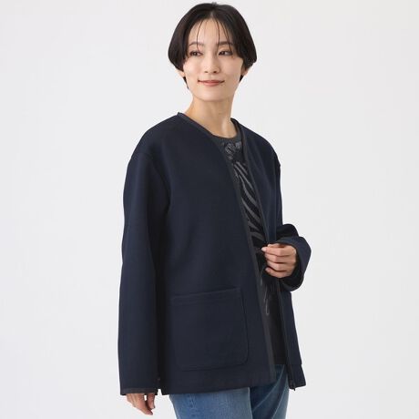 表側は暖かみを感じる綿100%、内側はさらっとしていて着用しやすいポリエステル素材のダンボールニット。程よい厚みがあり、着用期間の長いシーズンレスな素材感が魅力です。