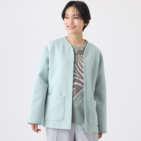 ダンボールニット素材を使用した、クルーネックのコーディガン。程よい肉感と丈感で、室内の軽い羽織としても、春先のライトアウターとしても活躍します。裏面には同系色のゼブラ柄をプリントしました。袖口を折り返して柄をのぞかせることで、スタイリングのアクセントになります。前端から衿ぐりにかけてあしらったグログランテープも、さりげないポイントに。軽やかな仕上がりを目指し、ファスナーの付け方にもこだわりました。