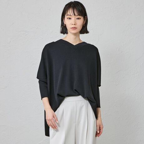 ネックラインは浅いVネック、袖は7分丈ですっきり仕上げています。