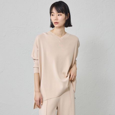 ネックラインは浅いVネック、袖は7分丈ですっきり仕上げています。