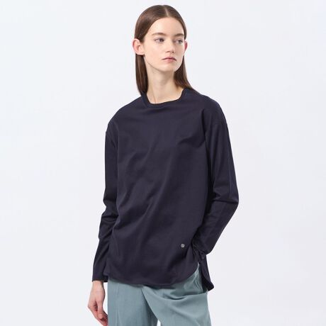 サイドに深めのスリットの入ったラウンドヘムのデザインカットソーです。一枚着はもちろん、レイヤードアイテムとしても重宝いただけます。