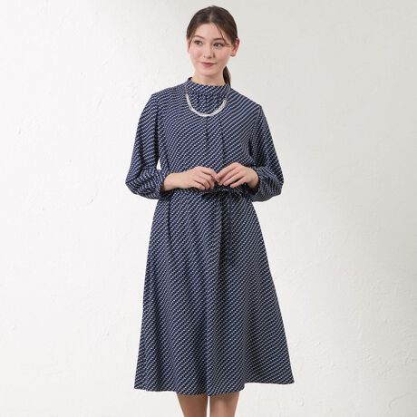 スタンドカラーが上品な印象のプリントドレス。
