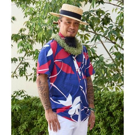 《Ocean Blue Bird-オーシャンブルーバード-》 ストレッチ素材を生かした、ややスマートでスタイリッシュなボタンダウンシャツ。ウッド調ボタンがポリネシアンムードを誘います。カジュアル、デイリーユースにもコーディネートしやすいデザインです。「ティアレトア」美しく咲く大輪のティアレが印象的なアートワーク。強く大胆なイメージに感じる清らかさと凛とした気品。シンプルなトライバルとのコンビネーションは伝統とモダンさの融合を表現したタヒチアンデザインです。