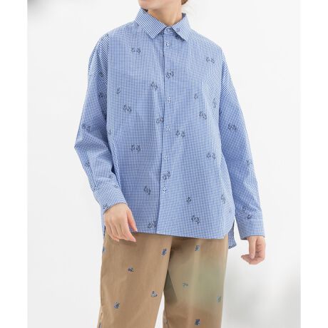 小さな線画のユーカリ模様をプリントした、オリジナルテキスタイルのシャツ。ゆったりとしたワイドシルエットで、メンズライクな雰囲気に。シンプルながら羽織としても使え、襟はしっかりと大きめに仕立てています。後ろが長めの前後差デザイン。開けた時にちらりと見える配色ステッチもポイントです。