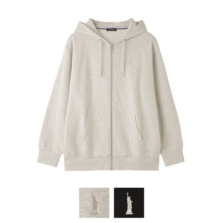 程よい厚みで着心地もよい裏毛パーカは通年着られる綿100%。大きめシルエットなのでアウター感覚で着ることも可能です。左胸にシルバーの女神刺繍入り。