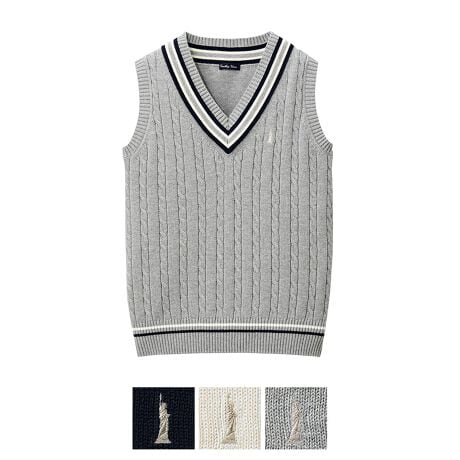ケーブル編みにラインを配した、大人っぽい印象のトラッドなベスト。さらりと着心地のよいハイツイストドライタッチコットンを使用。イーストボーイ独自の仕様で強度をUPしています。・肩のほつれを防ぐ為、通常より長めに糸始末をしています。・リンキング糸にポリエステル糸を1本入れ、強度を上げています。・裾リブ端のリンキング部分には、ほつれを防ぐ為にミシンで縫いを入れています。左胸には〈ヴィーナス〉の証、シルバーの女神刺繍入り