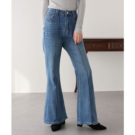 ラインを綺麗に見せるセンターシームをあしらったデニムフレアパンツ。