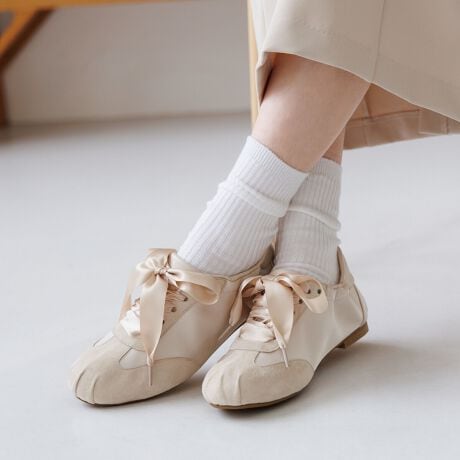 ノーマルなシューレースと幅広のサテンリボンシューレースの2種類が付いており、コーディネートに合わせて雰囲気を変えて楽しめます。
