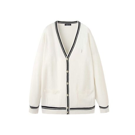 シックな配色のライン入りで、大人っぽい印象のカーディガン。12ゲージの薄手タイプでスッキリ見えるサイズ感。ブレザーのインや冷房対策にもおすすめです。ハイツイストドライタッチコットンを使用しており、強く撚りをかけた繊維の長い糸で目を細かく編むことにより、型崩れしにくく、光沢のあるきれいな表面感のニットに仕上げました。丈夫でサラッとした心地良い肌触りです。イーストボーイ独自の仕様で強度をUPしています。●肩のほつれを防ぐ為、通常より長めに糸始末をしています。●リンキング糸にポリエステル糸を1本入れ、強度を上げています。●袖口リブのリンキング部分には、ほつれを防ぐ為にミシンで縫いを入れています。●ポケットのほつれを防ぐ為、通常より長めに糸始末をしています。左胸には〈ヴィーナス〉の証、シルバーの女神刺繍入り。