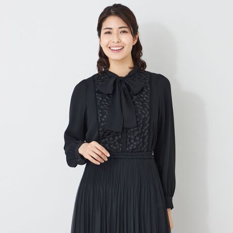 前身頃にフラワーチュール刺繍をあしらった華やかなブラウス。共布のリボンは取り外し可能で、気分やシーンに合わせたアレンジが楽しめます。インナーブラウスとしても活躍する汎用性の高さも魅力です。