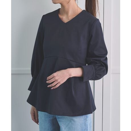 少し上めのウエストの切り替え位置で着るだけでスタイルアップが叶うブラウス。