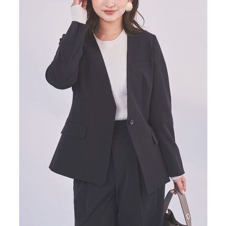 深めのVラインが顔まわりをすっきりと魅せるノーカラーデザイン