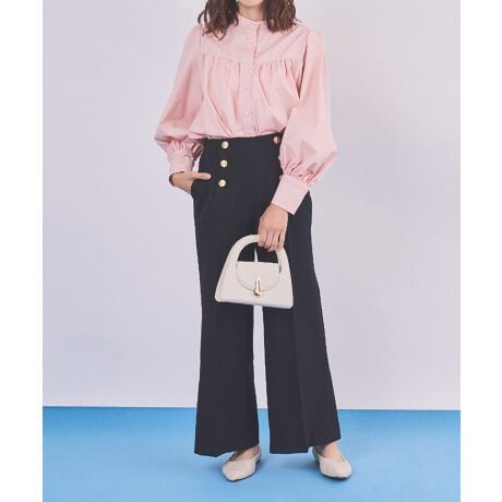 メタルボタンがアクセントになり、シンプルなトップス併せも映えるデザイン。